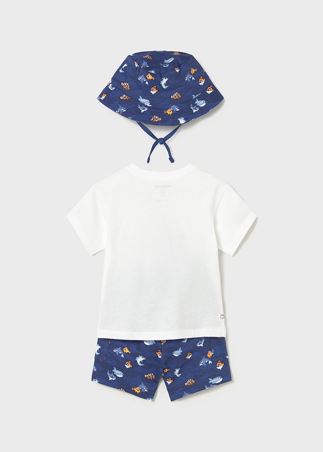 Special Delivery Royal Mail for next day from Mon - Thurs before 1PM £9.95 International Europe – £18.00MAYORAL Baby Boys knit set, short sleeved t-shirt with fish print shorts and bucket hat. Night 100% Cotton