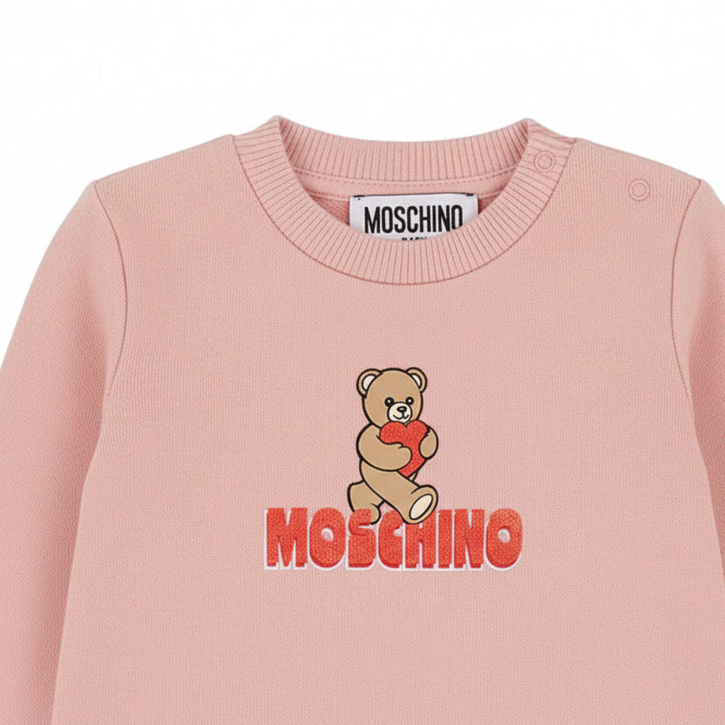 MOSCHINO Baby Pink Dress with Heart & Teddy Bear Logo A charming pink dress for baby girls, featuring the iconic MOSCHINO heart and teddy bear logo. Perfect for special occasions or everyday wear.