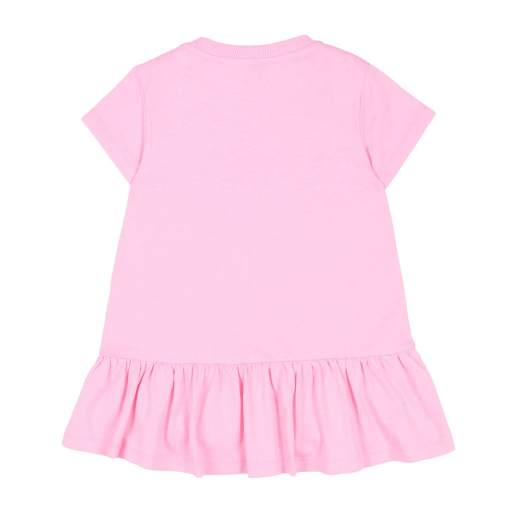 MOSCHINO Kids dress featuring the iconic Teddy Bear clutching a heart. Crafted from soft cotton jersey with short sleeves, dropped waist, and gathered skirt. Shoulder poppers enable quick dressing. Bonbon Pink.