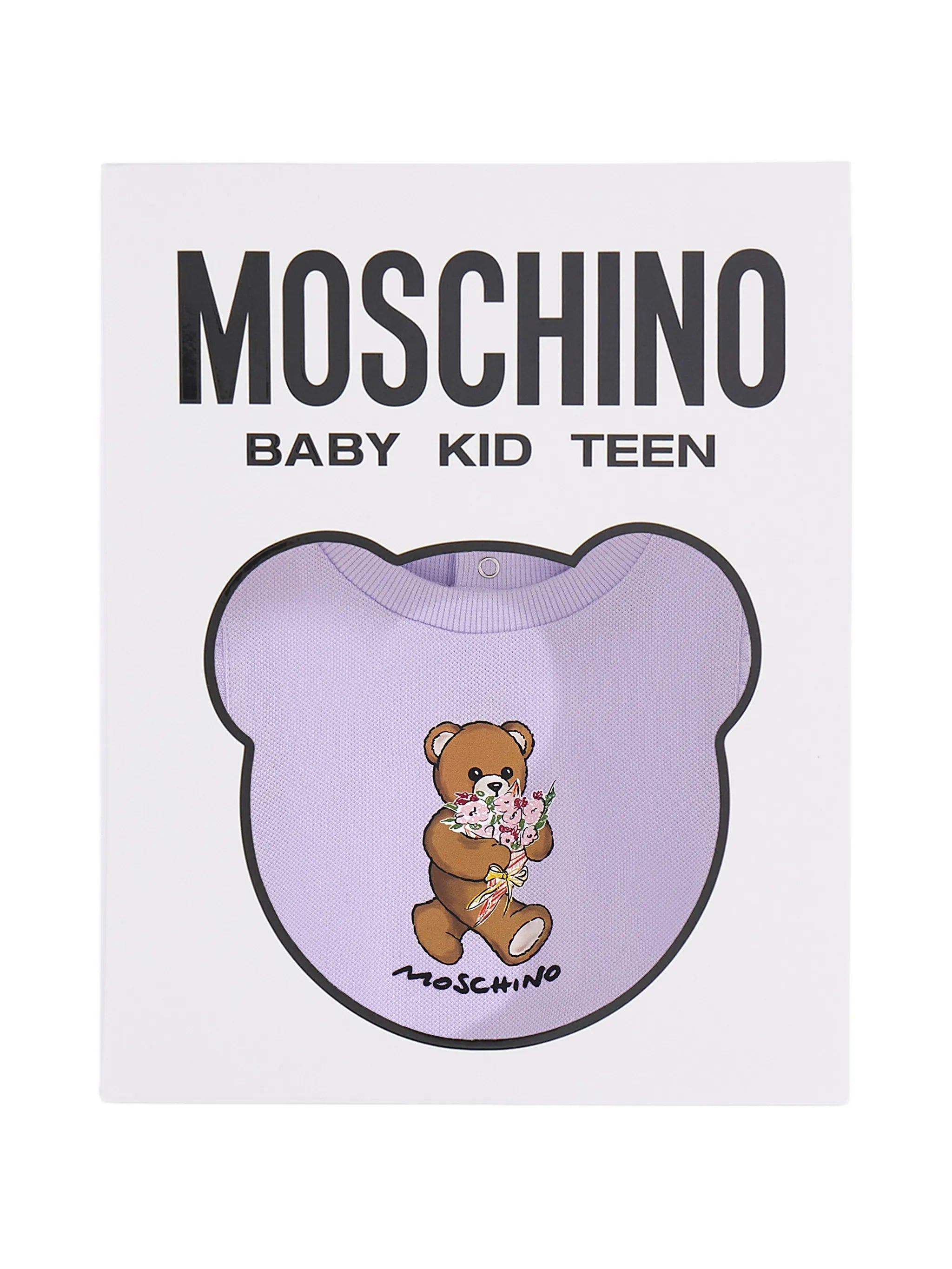 A MOSCHINO baby girls dress in pastel lilac cotton piqué, adorned with the brand's signature teddy bear print and rubberized logo. Ribbed neckline and ruffled sleeves offer refined detailing, while back popper fastenings ensure effortless dressing. Arrives in a branded gift box.