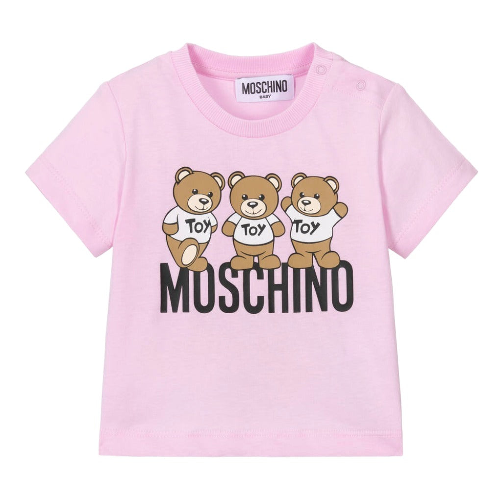 Special Delivery Royal Mail for next day from Mon - Thurs before 1PM £10.99Baby Girls Teddy Bear print t-shirt with Moschino logo Pirouette Pink T-Shirt. Soft cotton, round neck, long sleeves, button Fastening.