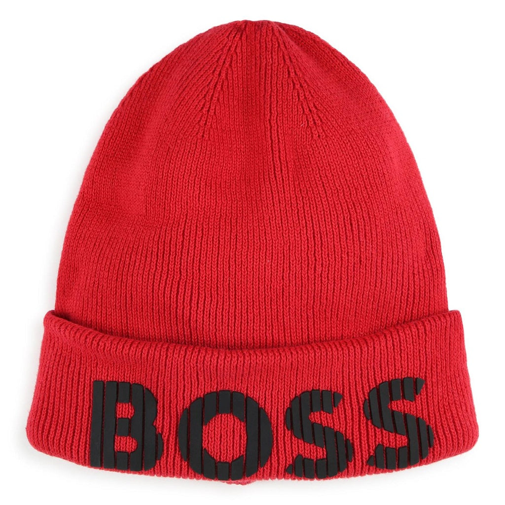 Special Delivery Royal Mail for next day from Mon - Thurs before 1PM £10.99BOSS Knitted beanie with turn-up, in cotton, double layer knit for more heat. Branded rubber-effect on front. Red
