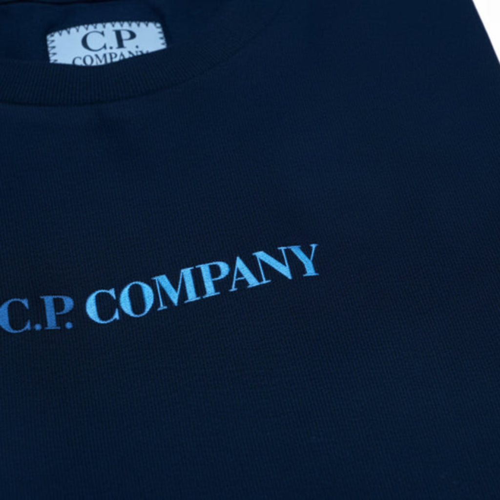 C.P. COMPANY Boys Cotton short sleeved t-shirt. Chest and back with printed logo, ribbed crewneck.  Maxi Fit. Total Eclipse Blue