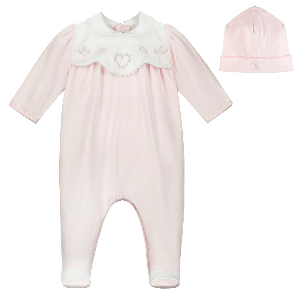 Special Delivery Royal Mail for next day from Mon - Thurs before 1PM £10.99EMILE ET ROSE FERN This pretty little babygrow in pale pink is perfect for picnics and playdates. The top part has a white curved over-yoke edged with ric-rac. Beautiful floral heart and spray embroidery in shades of pink and grey, sit along the curved edge just below a rounded white collar. The gathering gives a relaxed fit to this garment and a matching pink hat makes this a truly lovely set. 100% Cotton