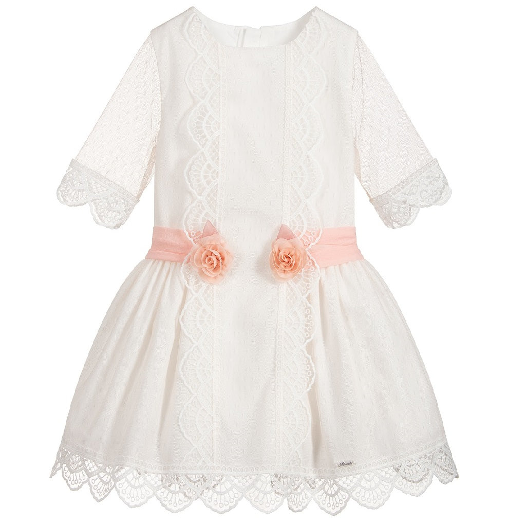 Special Delivery Royal Mail for next day from Mon - Thurs before 1PM £10.99Girls ivory and pink dress by Miranda Girl's dress with a pale pink sash with two flowers at each end of the waist and ending in a large bow at the back. It has lace embroidery on the hem of the sleeves and skirt as well as on the front of the dress. Button from behind. Inner lining.