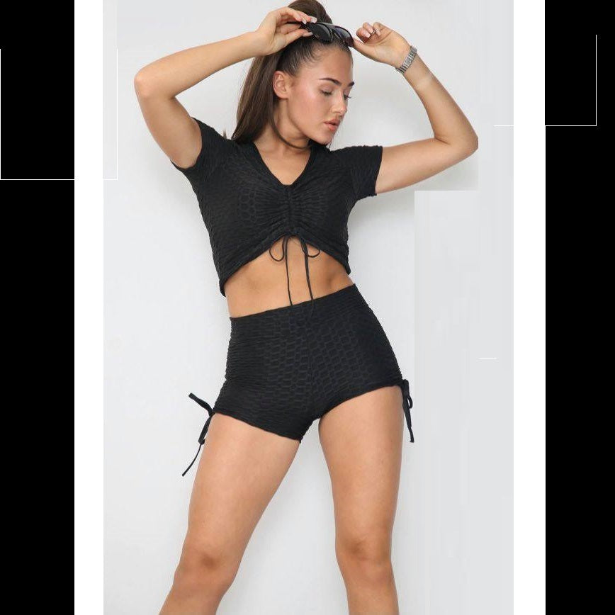 Special Delivery Royal Mail for next day from Mon - Thurs before 1PM £10.99Push-up short, high waisted & have gathered sides. Ladies short sleeved gathered front top with racer back. Honeycomb texture stretchy set!