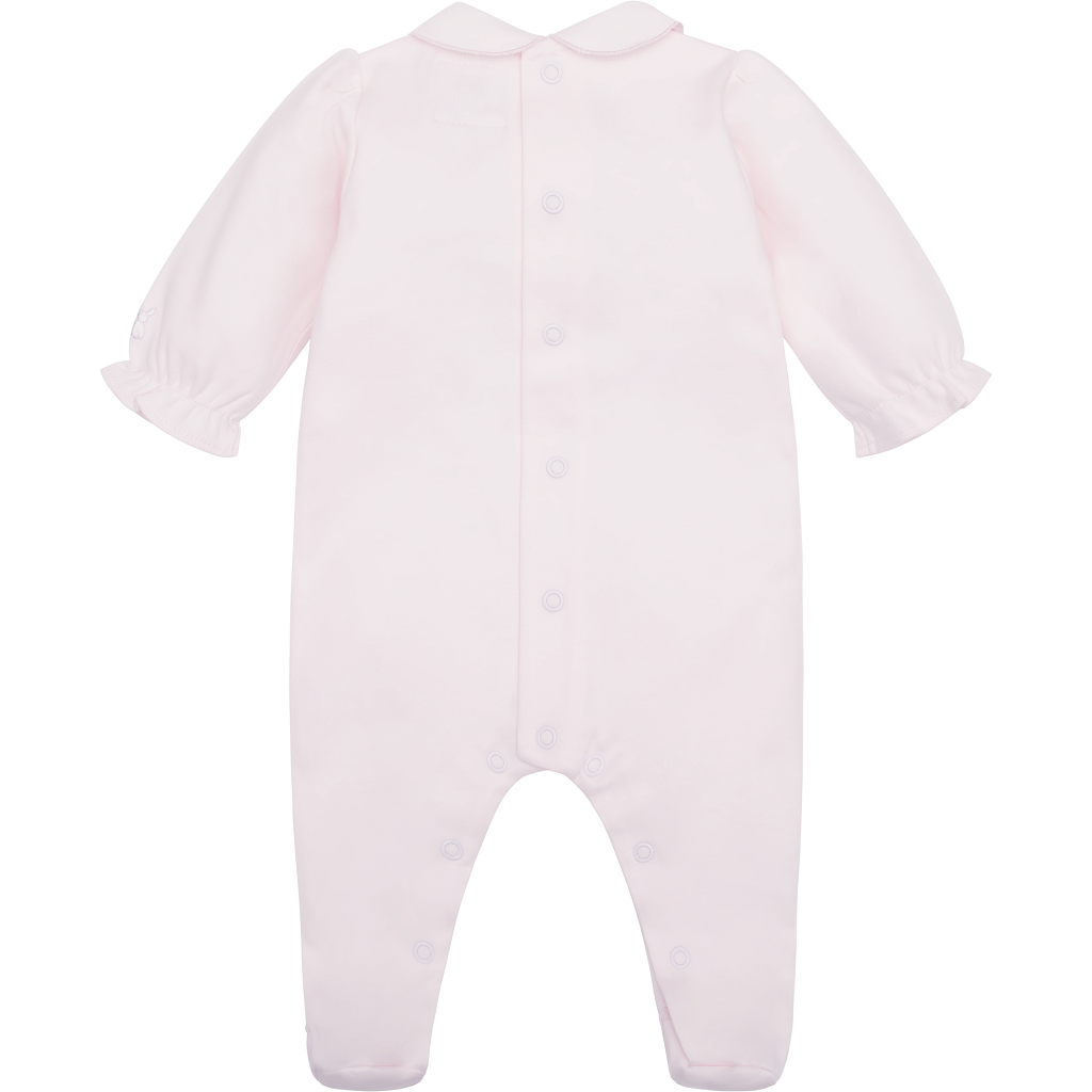 Special Delivery Royal Mail for next day from Mon - Thurs before 1PM £10.99EMILE et ROSE signature pink, the Kelly babygrow is absolutely beautiful ! A scalloped edged embroidered collar, mock front opening with the same pink and white embroidery and scalloping make this a special garment. Frilled sleeves and lace trim to the ankles are lovely feminine finishing touches. 100% Cotton