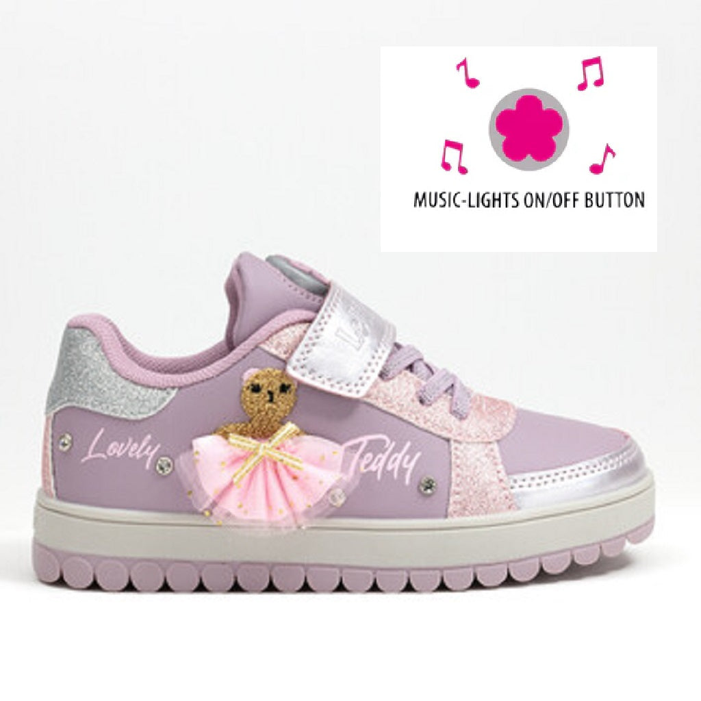 These trainers sparkle with silver and pink accents, decorated with a charming embroidered teddy bear and a pink tulle tutu that can be swapped, topped with a gold bow. Press the flower-shaped button on the tongue to hear Lelli Kelly's magical jingle and see pink lights flash. Designed with the innovative Roly Sole for excellent comfort and support, they feature a hook & loop closure for easy wear. Made from breathable materials with a soft lining to keep little feet comfortable as they grow. Comes with a special gift included.