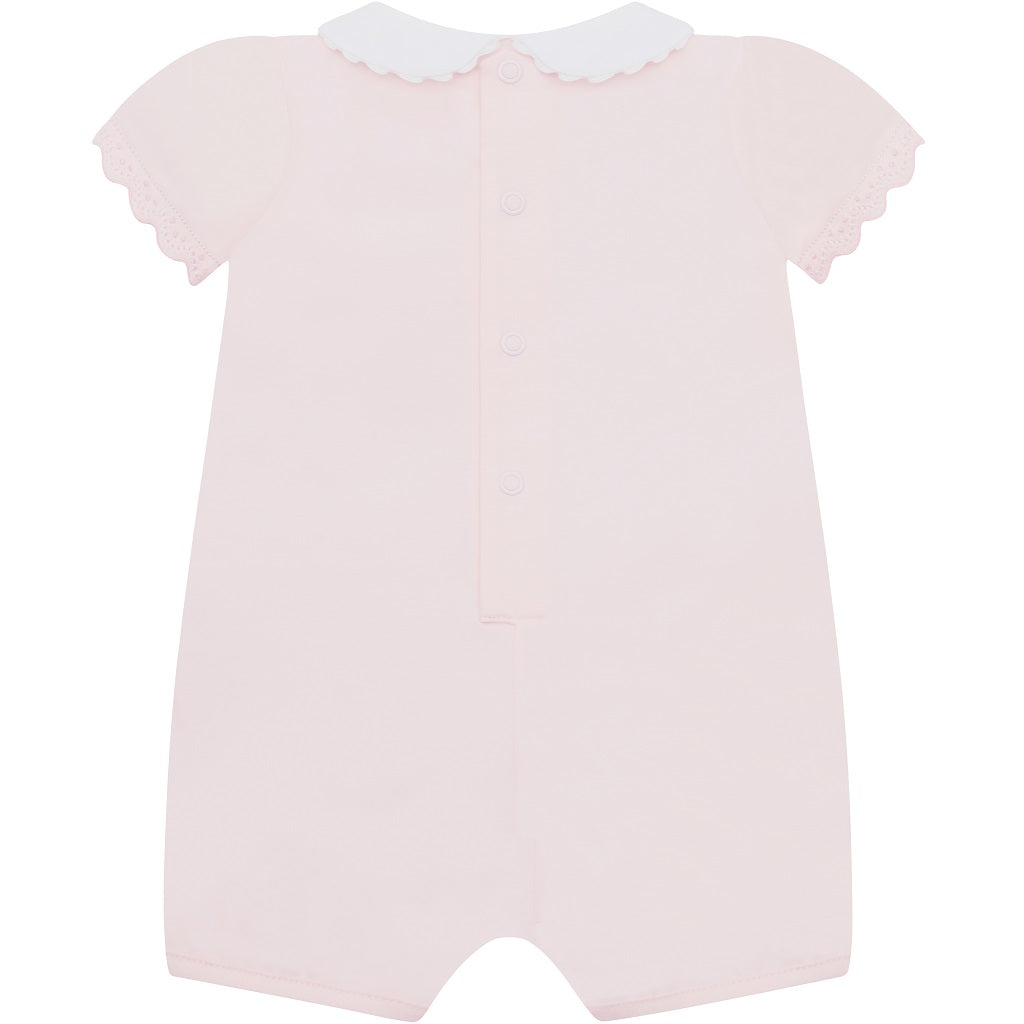 Special Delivery Royal Mail for next day from Mon - Thurs before 1PM £9.95 International Europe – £18.00EMILE ET ROSE Louise is a very pretty romper, perfect to keep baby cool on a hot summers day! All in pink, with a white rounded collar the stand out features of this garment are the curved pockets with scalloped lace effect edges. Just like our Luna two-piece, intricately embroidered floral stems spring from each pocket. Scalloped lace effect sleeves and pink ric-rac around the collar are a lovely finishing touch. 95% Cotton 5% Elastane