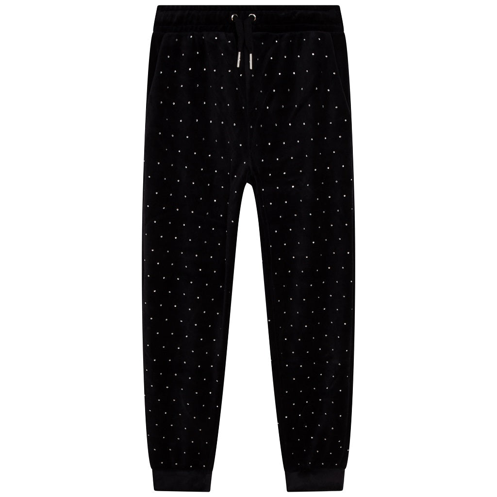 Velvet jogging pants with allover rhinestones, "MK" medal at the bottom, elastic waist with drawstring, two pocket at the front, ribbings on the bottom