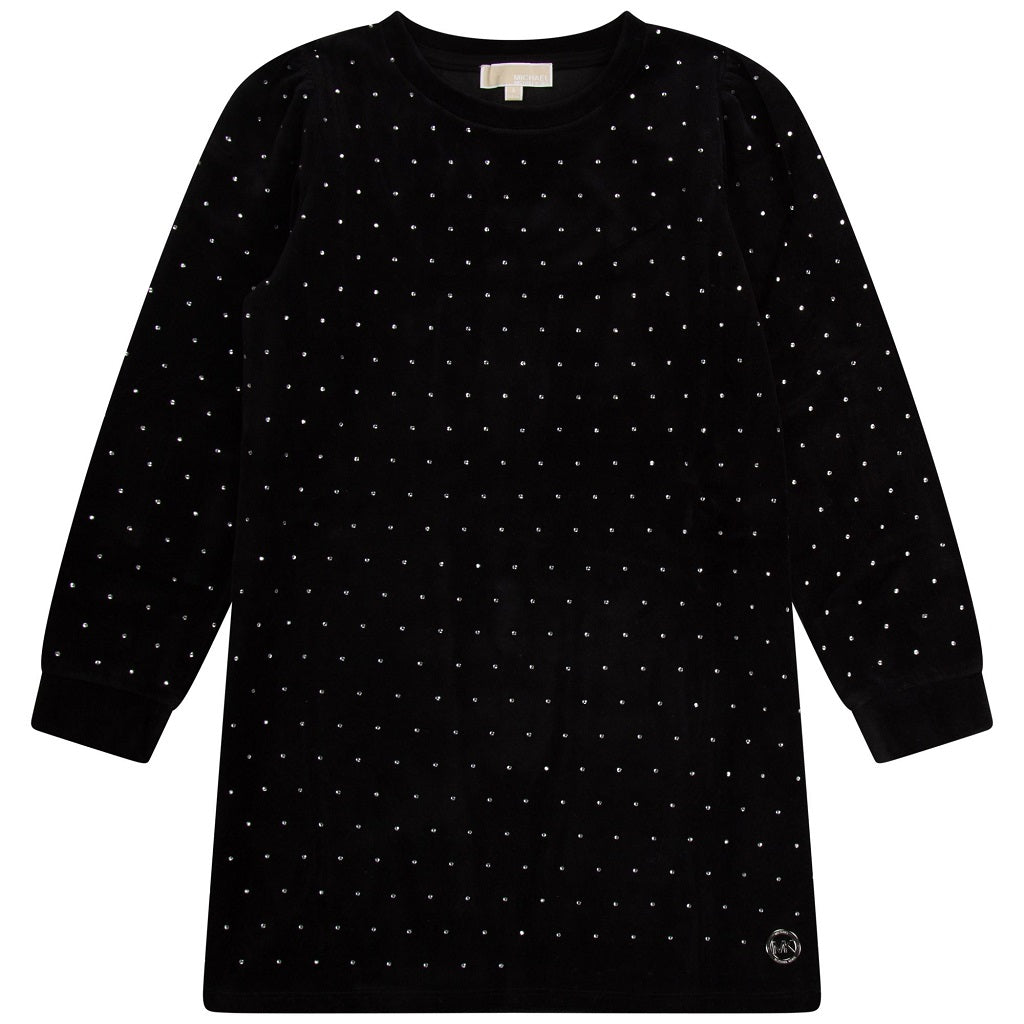 Velvet dress, long sleeves, round collar, rhinestones in allover, gathers on shoulders, "MK" medal at the bottom