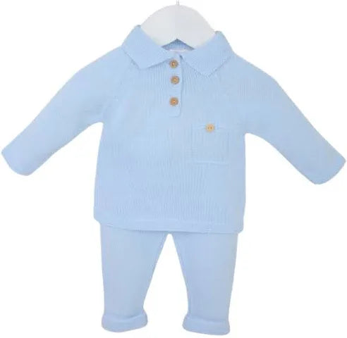 Special Delivery Royal Mail for next day from Mon - Thurs before 1PM £10.99PEX Knitted in super smart soft pastel blue yarn, this perfect classic little boys suit is comfy as well as ultra stylish. The smart top has a traditional Polo style collar buttoned neck with smart mock buttoned pocket at the chest. The matching trousers have super smart turn up cuffs and a comfortably elasticated waistband.