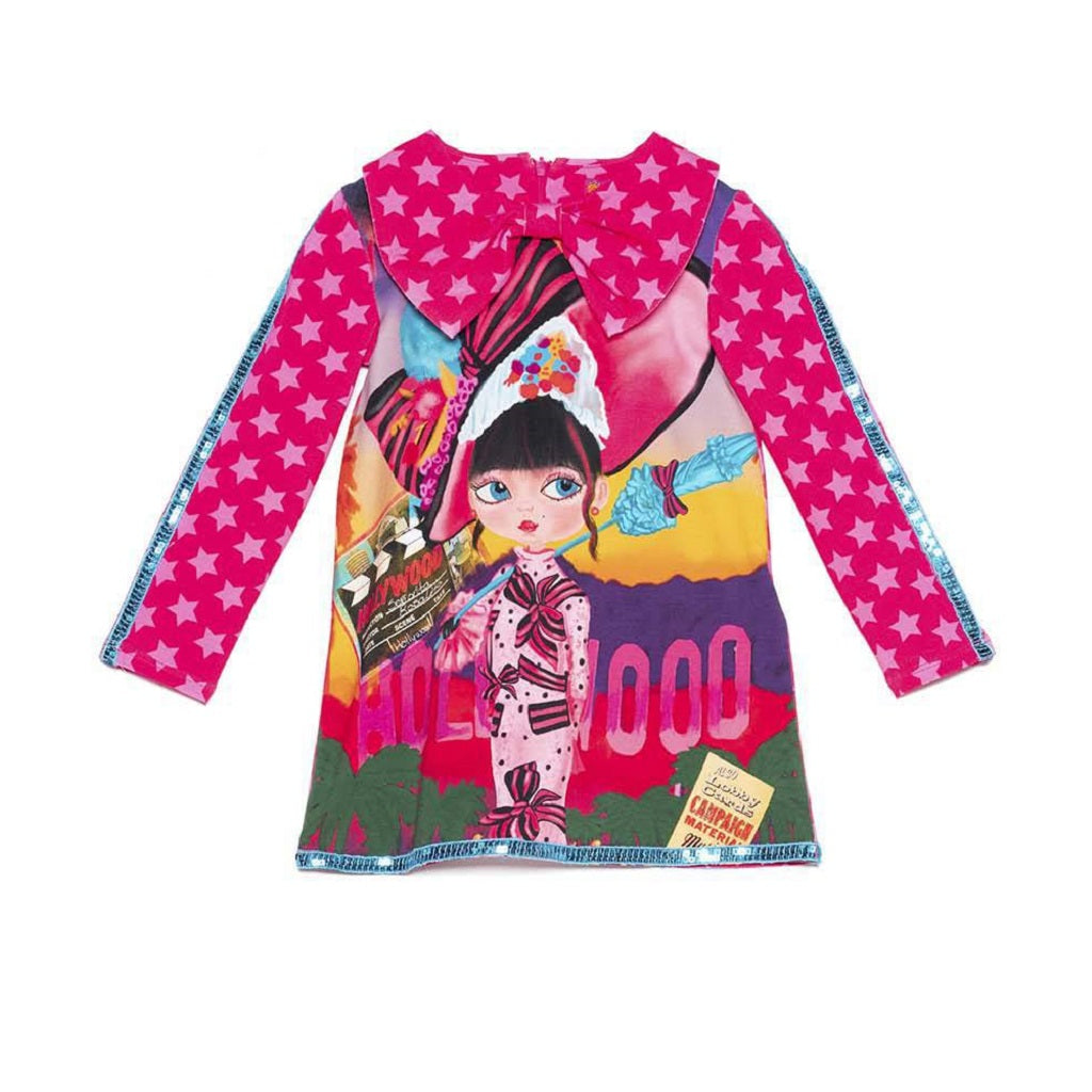 Special Delivery Royal Mail for next day from Mon - Thurs before 1PM £10.99ROSALITA SENORITAS Cobalt Long sleeved dress with round neckline and faux bow detail on top. Fuchsia base with pink star print and contrasting front print. Light blue sequin ribbon detail on sleeves and hem. Invisible zip closure at the back.