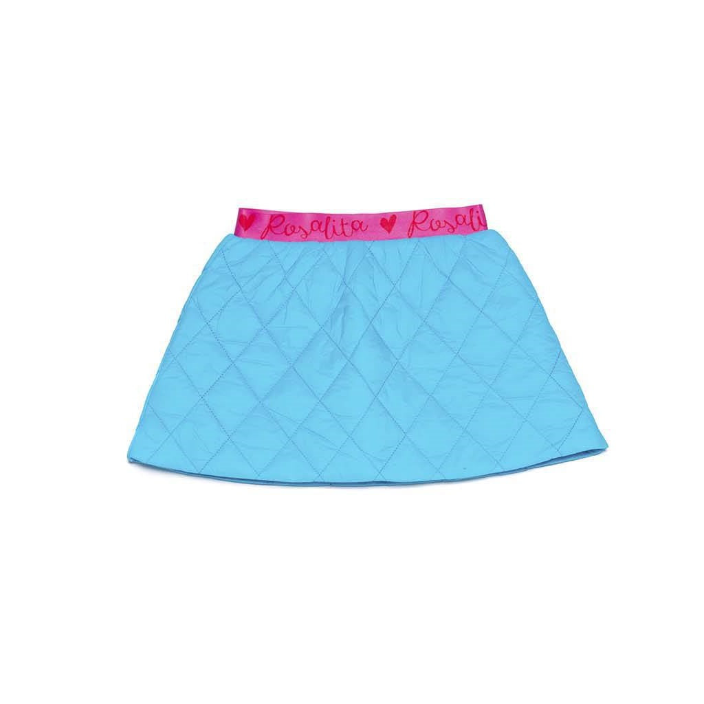 Special Delivery Royal Mail for next day from Mon - Thurs before 1PM £10.99ROSALITA SENORITAS MCCOLL Turquoise quilted skirt. Pink contrast elastic waistband with red letters and hearts.